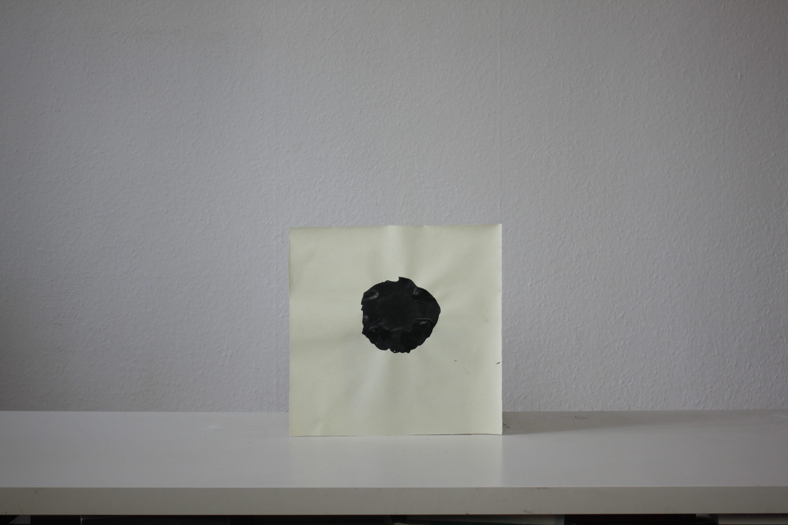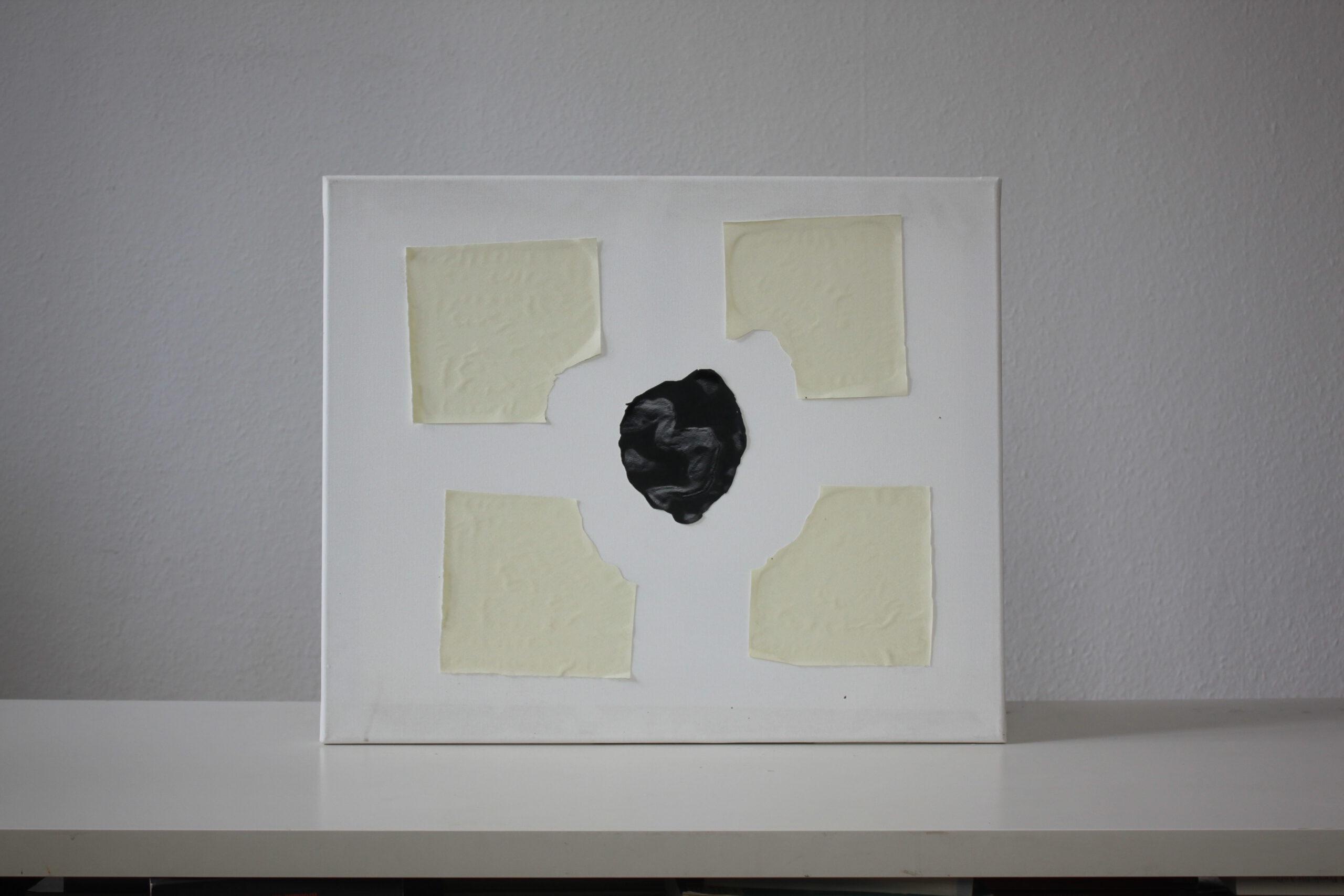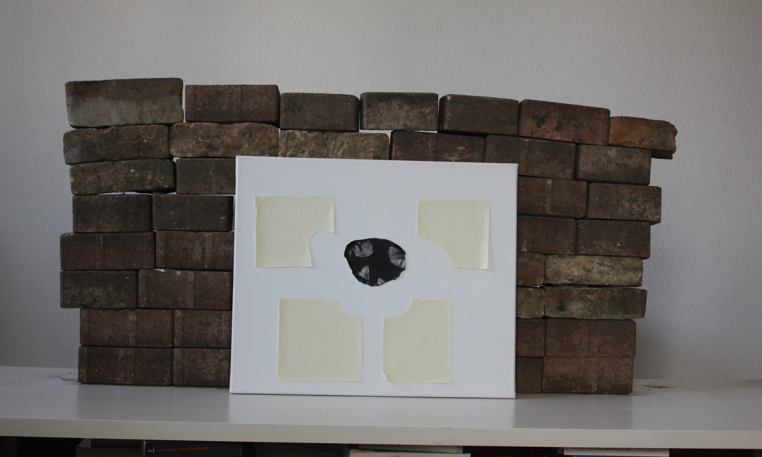 The artwork consists of three parts: a blotting paper stained with black oil paint, a canvas on which a corresponding copy of the first piece is cut up and adhered, and a third part where a copy of the second piece is attached to a loosely assembled brick wall. The materials and construction are intentionally minimalistic, directing attention to the essential characteristics of objects within spaces. This approach is also a commonality with „Study #4.“